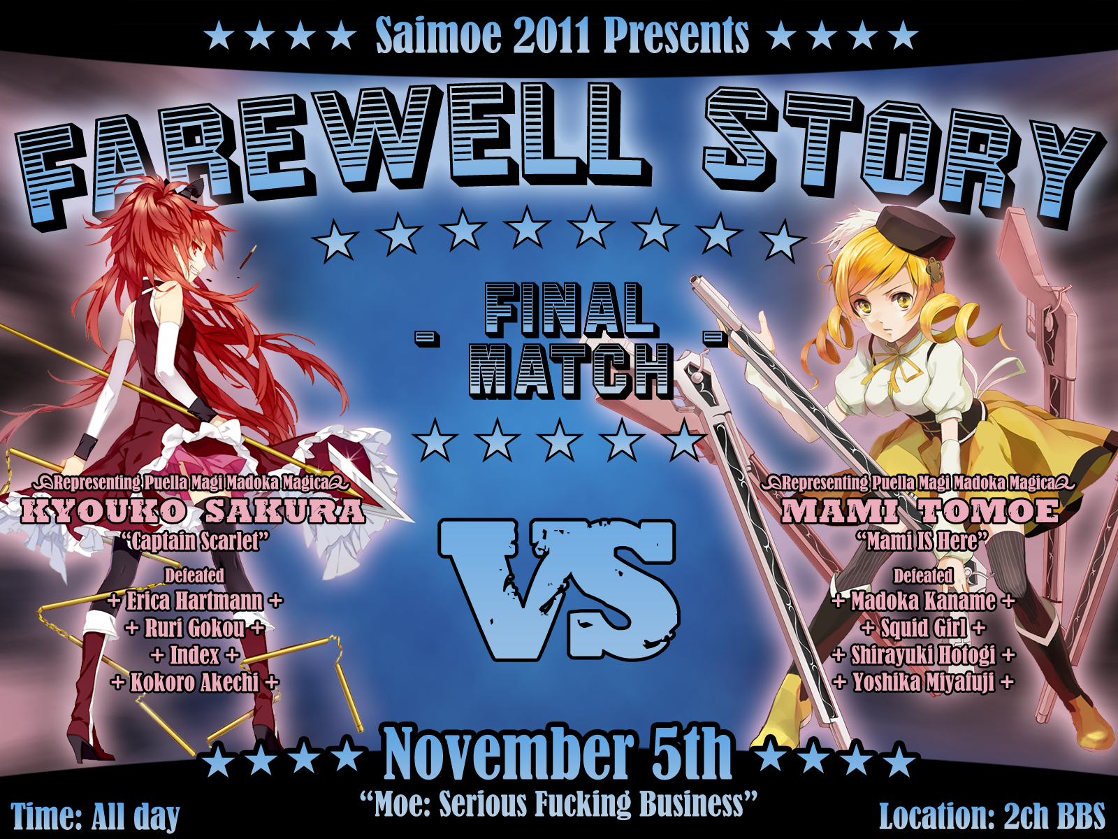 This edition was marked by the dominance of Shaft's original TV show Mahou Shoujo Madoka Magica. The anime, which was released on Winter 2011, dominated the minds of many watchers and imageboard users because of its cute girls, unique visuals, deep lore, and a plot full of mind-bending twists and turns. The series also spawned massive amounts of internet memes and fan art created by Japanese artists. Naturally, the show's popularity in Japan (and to a lesser extent North America, the primary demographic of English-language imageboard 4chan) also led to Madoka Magica girls dominating this contest: four members of the main quintet reached the elite eight stage, and would've occupied the entire final four too if two girls didn't face each other in the quarter-finals. The show's presence in the tournament prompted some users to label it "SaiMadoka".